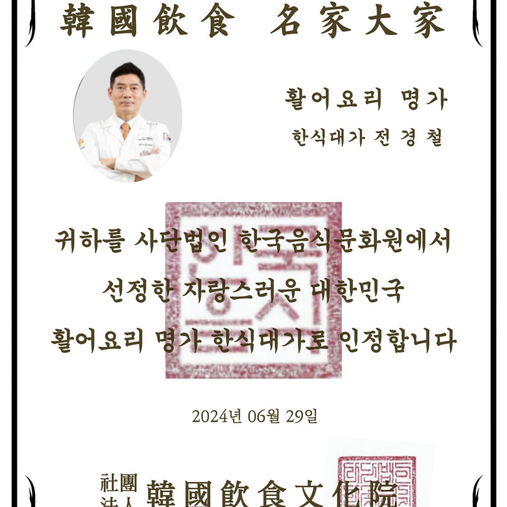 활어 요리2025-06-17명가 대가 전경철 활어 요리 명가 – 한식 대가 국가공인 조리기능장 혜전대학교 호텔조리계열 계열장 대학민국 조리 명인 조리국가대표팀 단장 역임 그랜드인터컨티넨탈호텔 셰프 역임 이전 글 약선 음식 다음 글 발효 음식